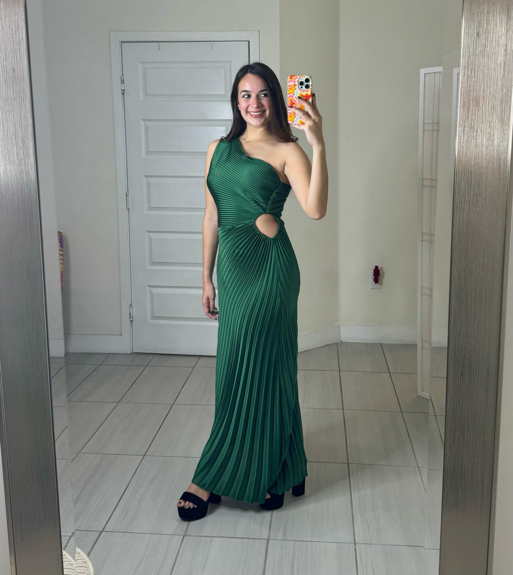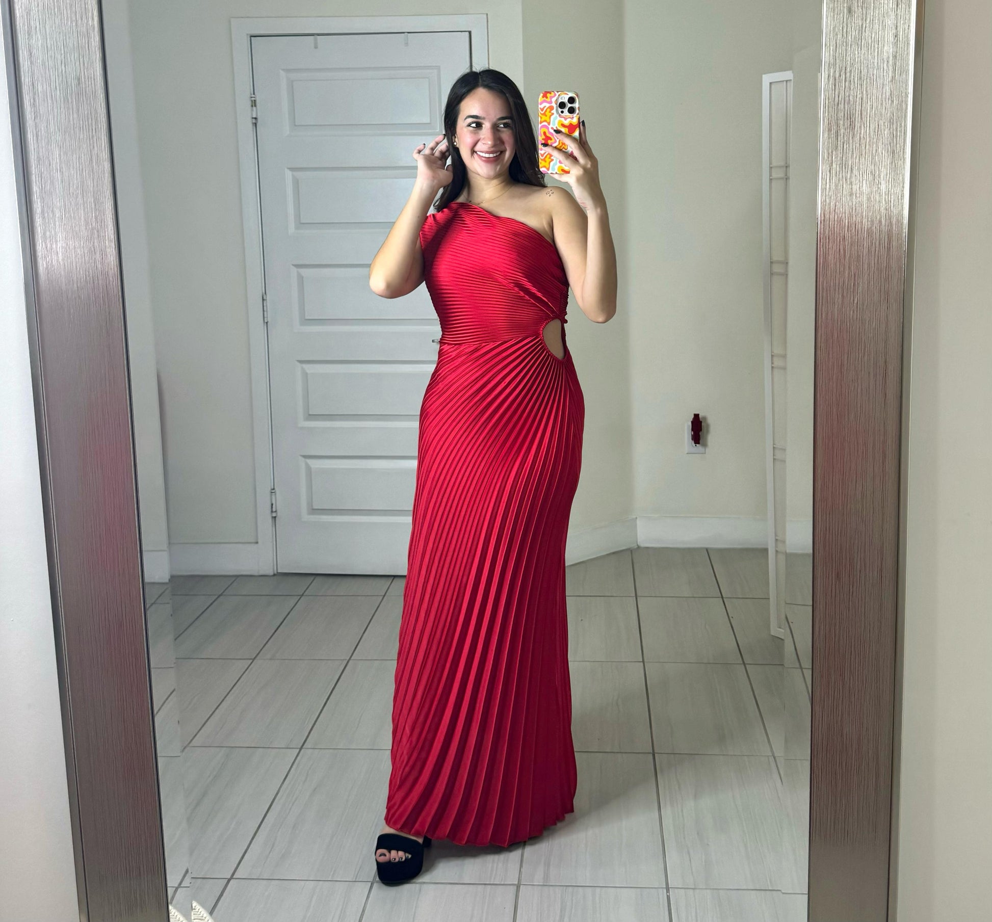 Elevate your elegance with the Allison Dress: One size, pleated design, perfect for Small to Large, available in blue, red, and green.