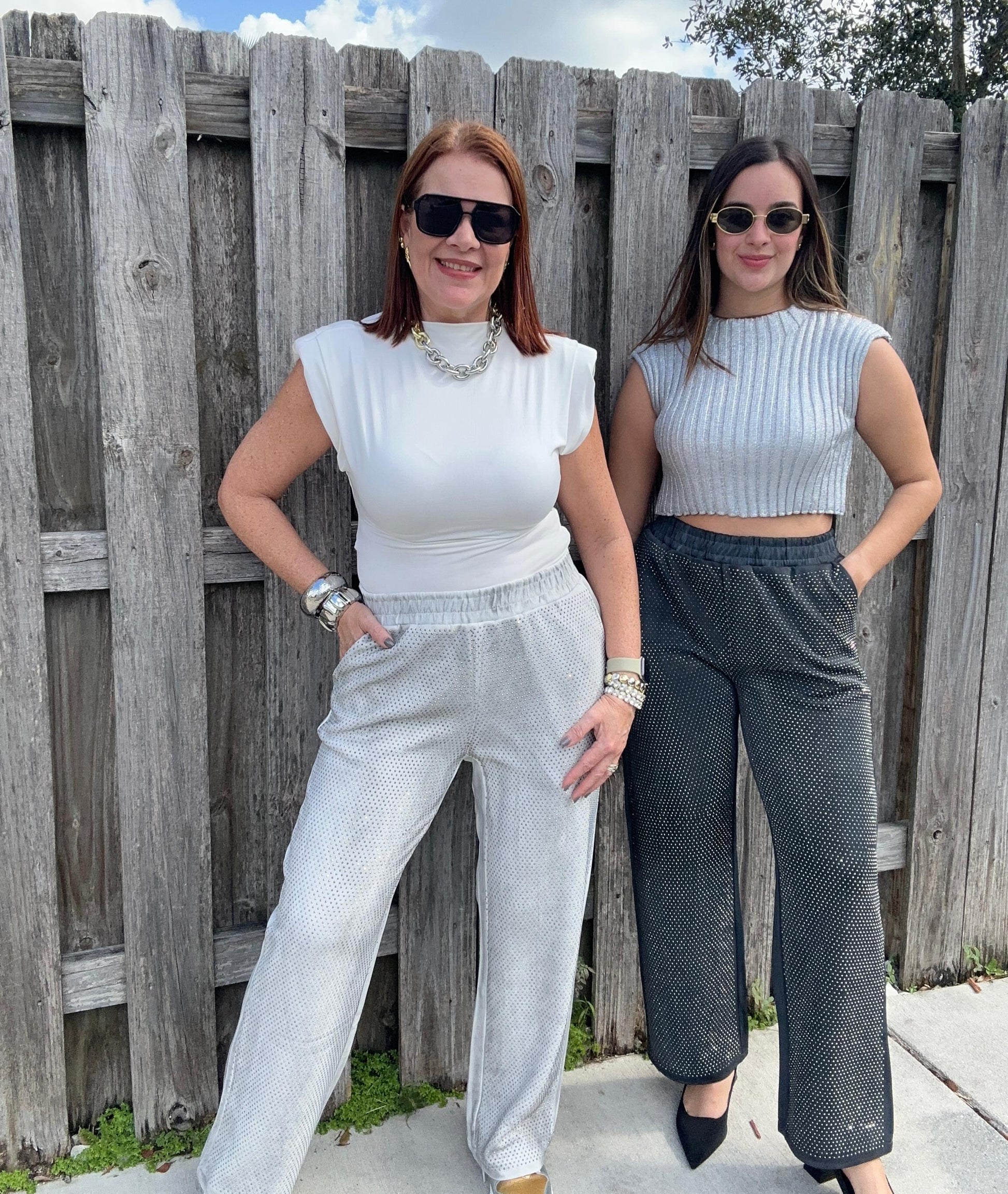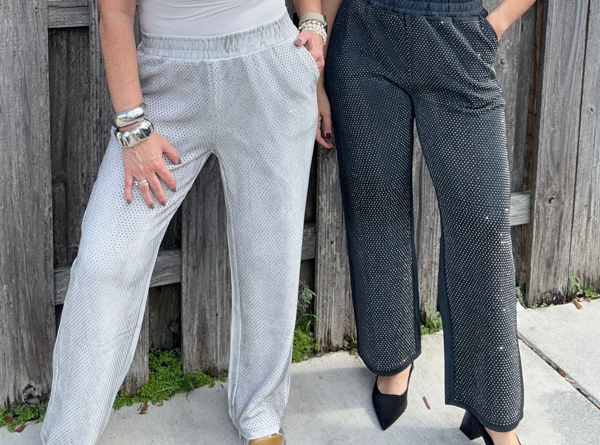 Upgrade your wardrobe with our Amelia Pants! These jogger pants feature a unique blend of cotton and shimmering fabric on the front, guaranteeing both comfort and style. Perfect for adding a touch of glam to your everyday look. Don't miss out on this must-have piece!