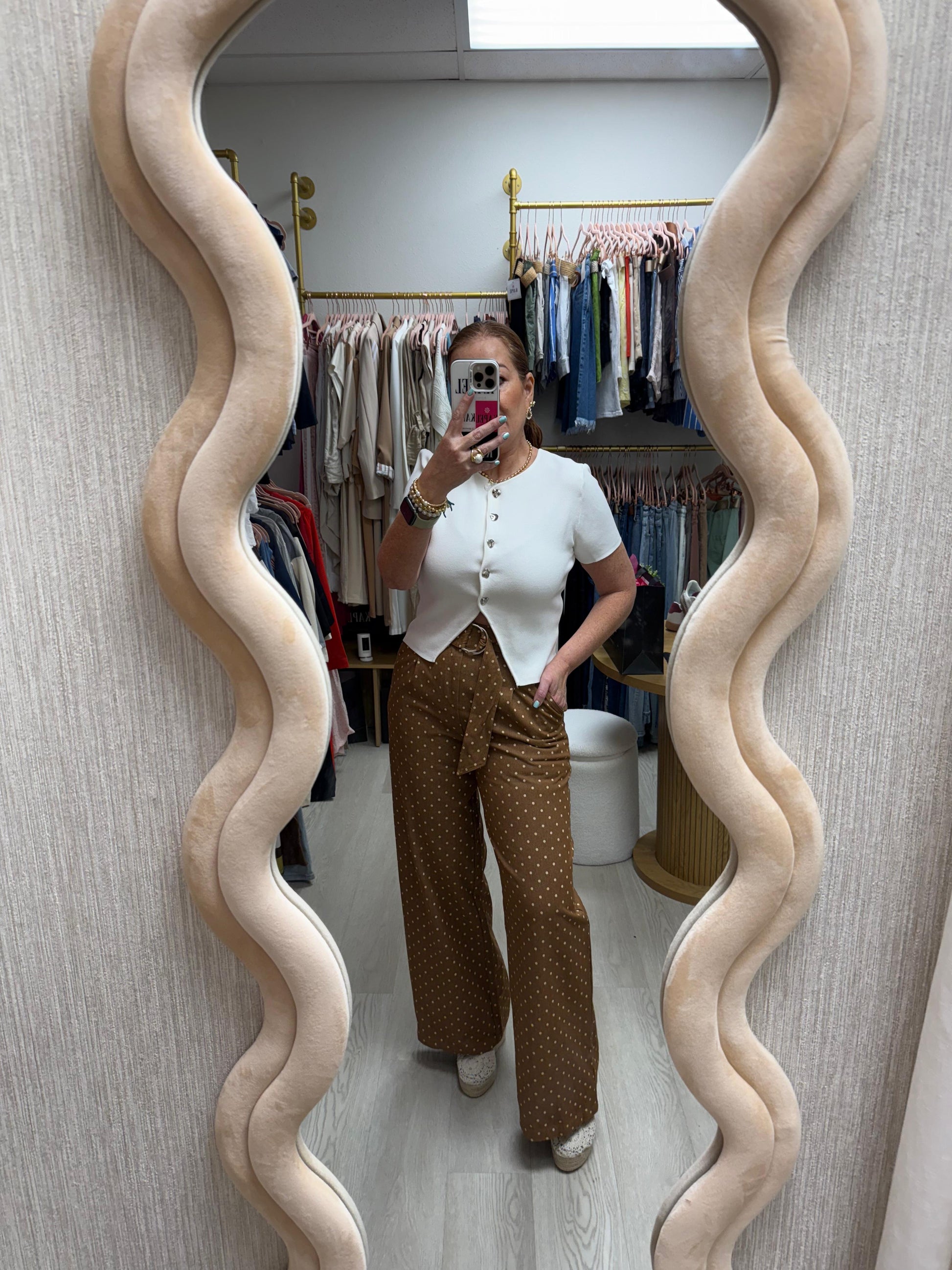 These Anastasia Pants feature a stylish polka dot pattern on durable jean-like fabric, offering a true high-waist fit without any spandex. Designed to provide a flattering silhouette with comfortable structure, they combine classic style with everyday wearability. Perfect for those seeking a chic, reliable addition to their wardrobe.