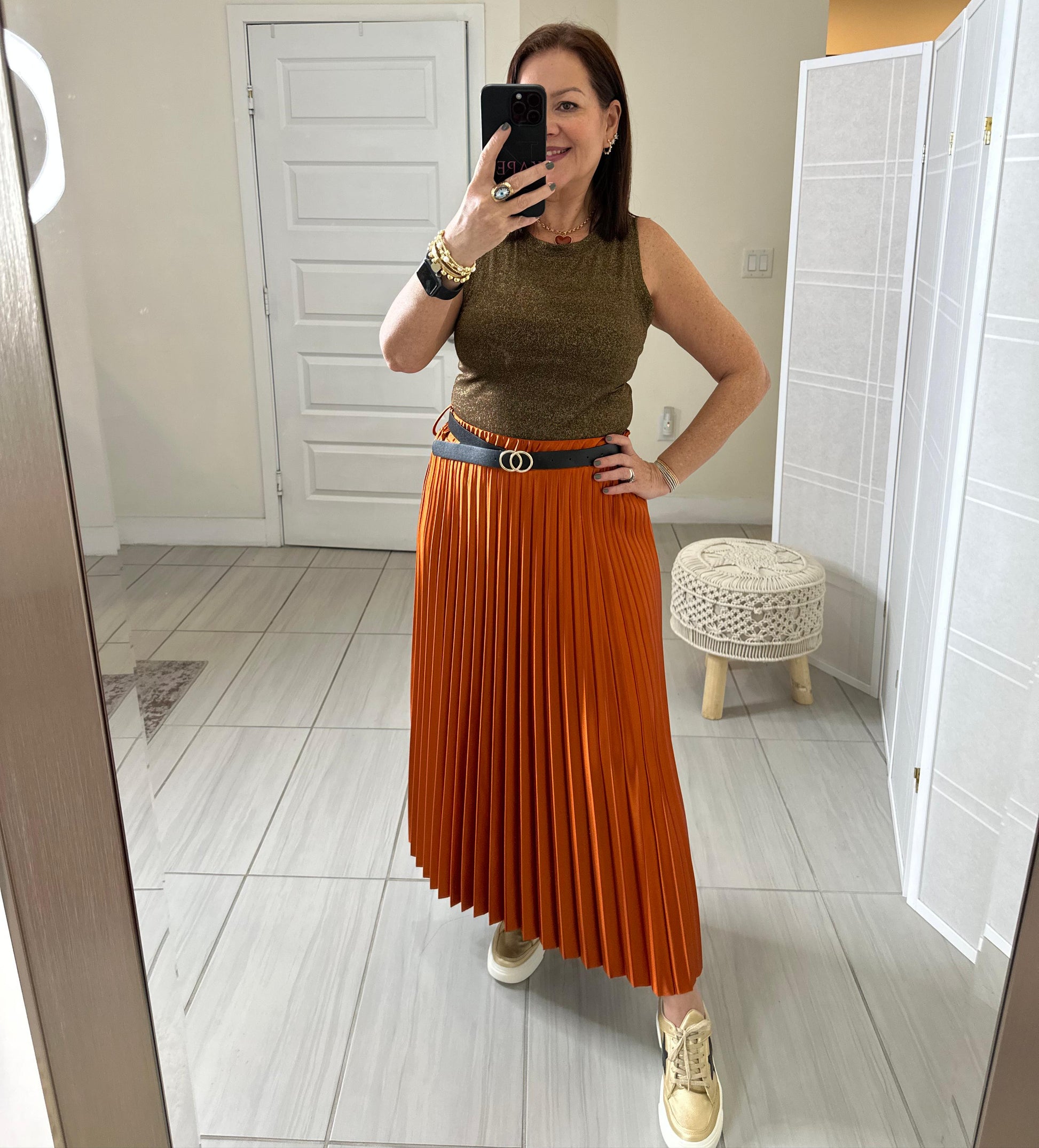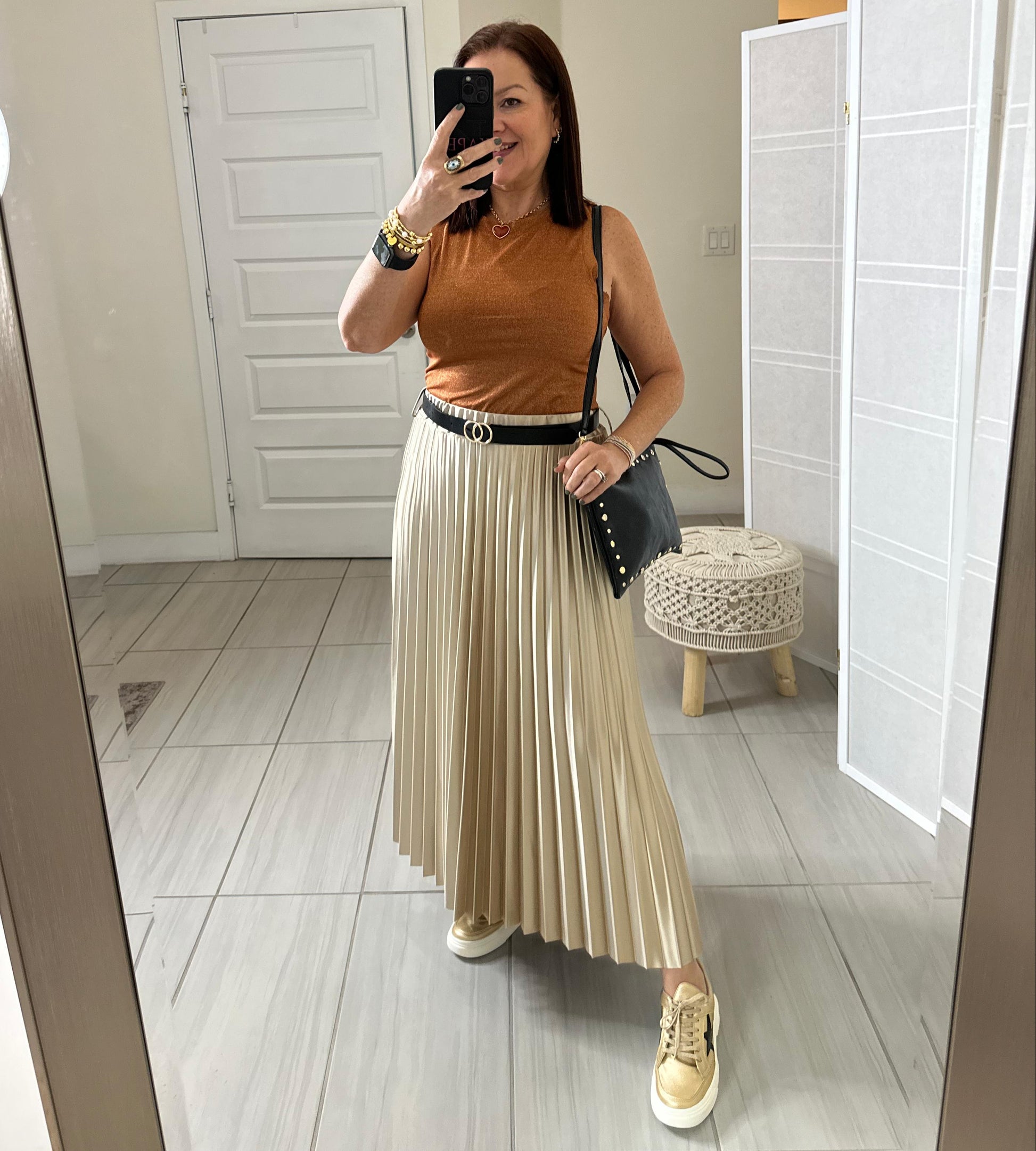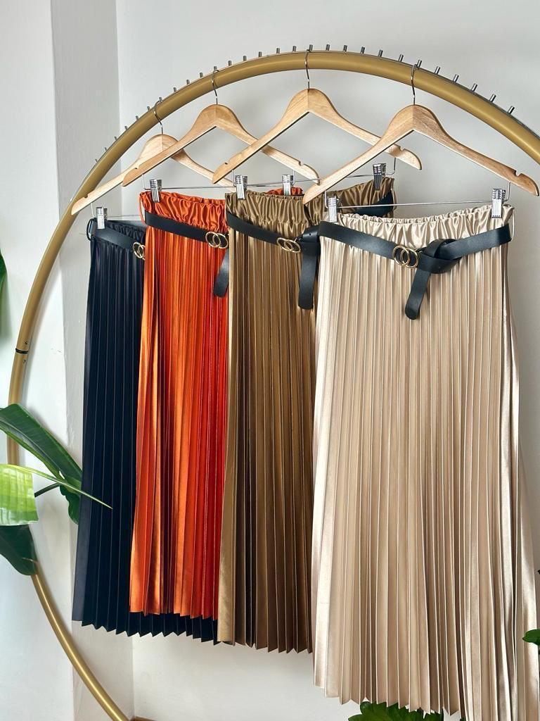 Elevate your elegance with the Aurora Silk Skirt: Made in Italy, one size with an elastic waist, perfect from Small to Large, available in ocre, dark beige, and light beige.
