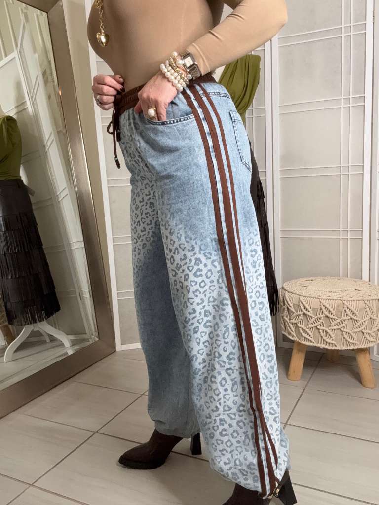 These jeans combine style and comfort with their elastic waistband and leather details that enhance their unique design. The side stripes add a modern and versatile touch, allowing you to wear them scrunched at the boot for a casual look or plain for a more polished look. Perfect for those looking for adaptable fashion without sacrificing comfort.