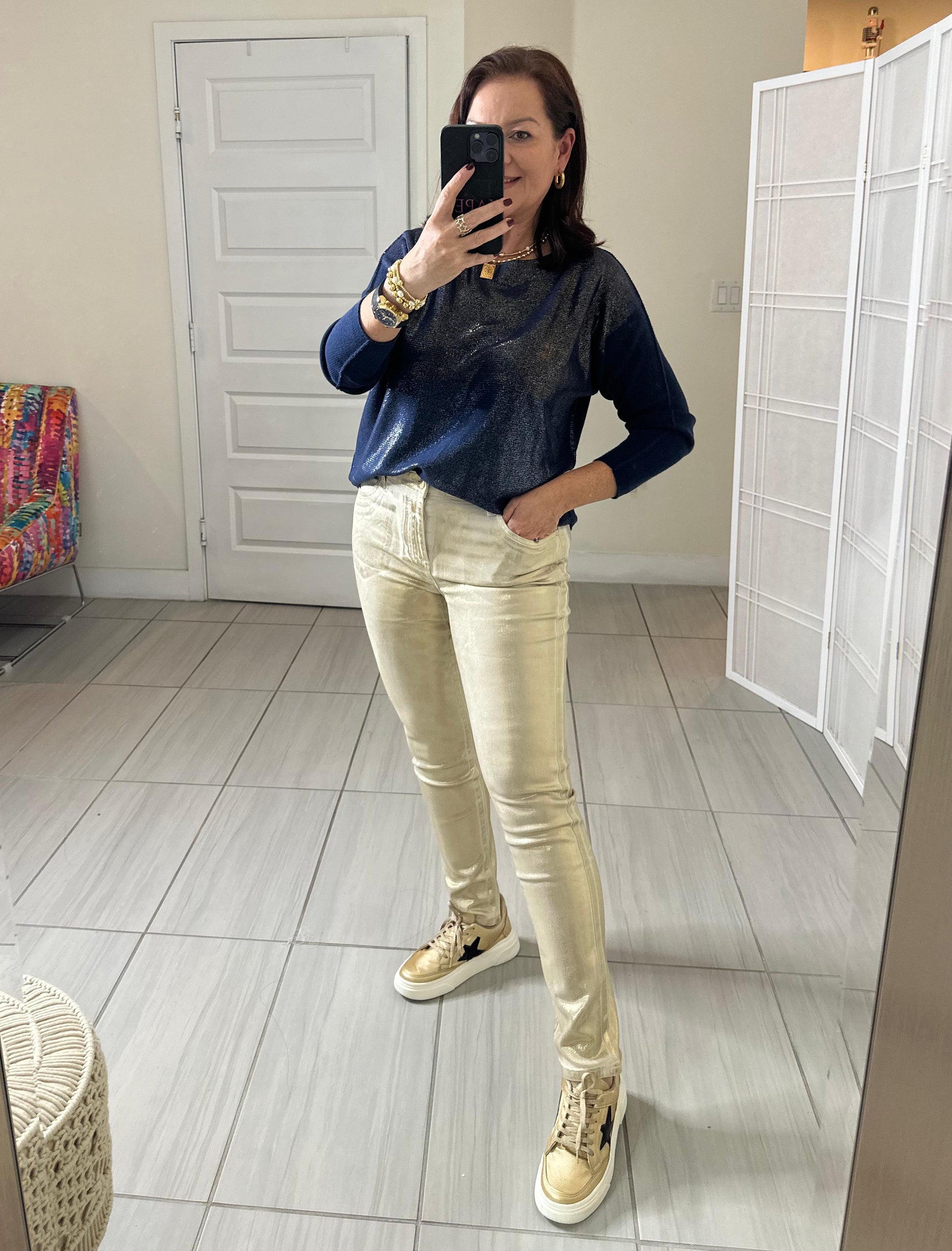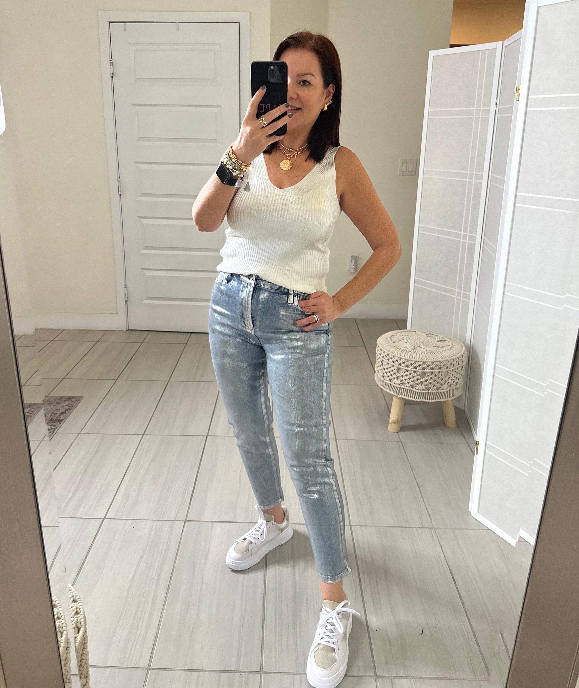 Dazzle in our Chantal Jean. Full stretch with a silver metallic finish. Elevate your denim game with style and comfort.