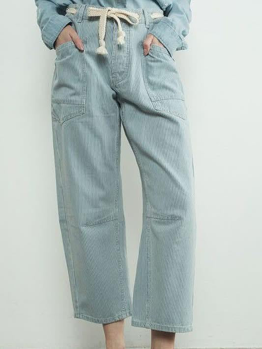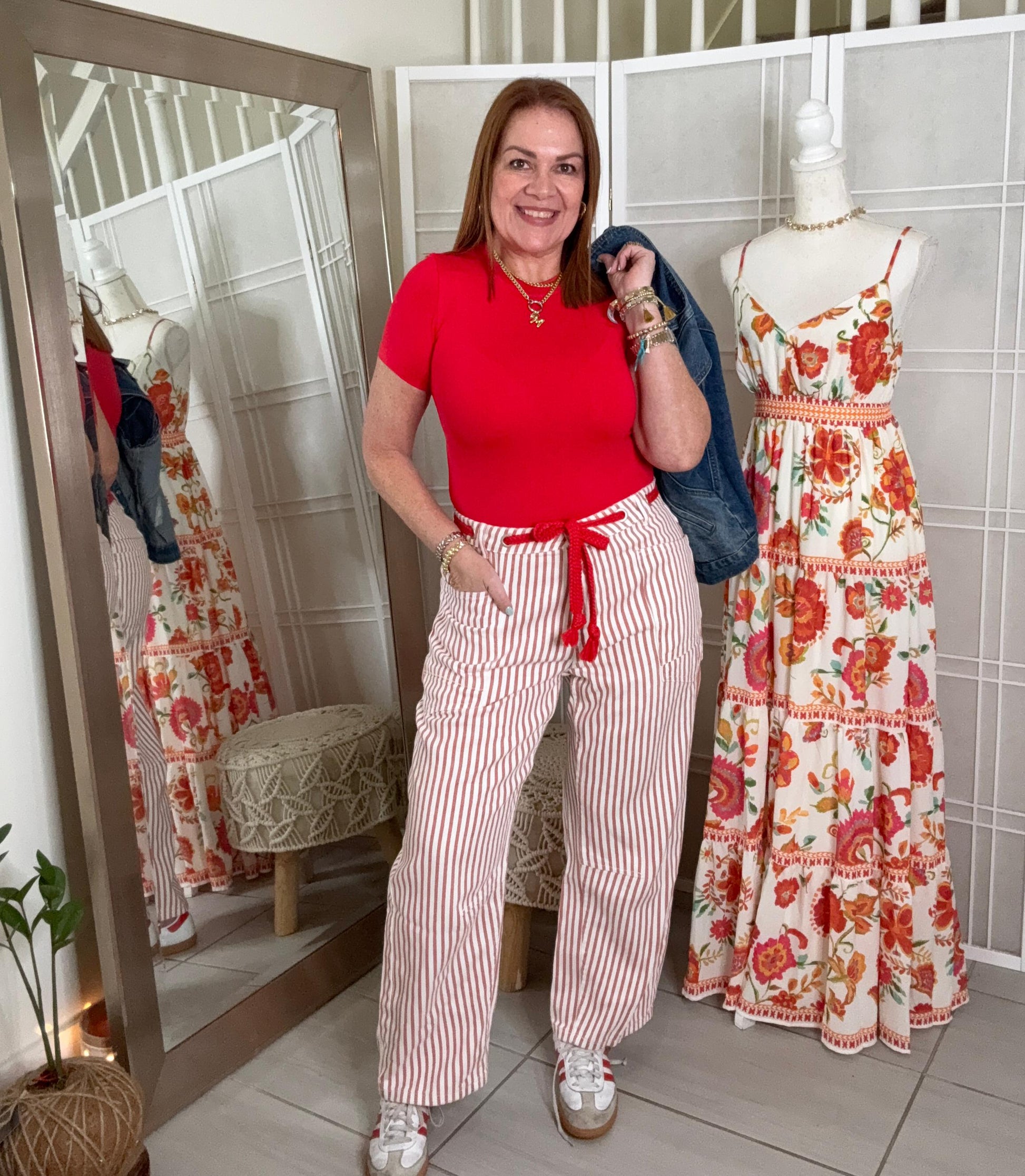 Elevate your style with the Clarita Jean, featuring a flattering high waist and bold red stripes for a standout look. Designed to fit true to size, this barrel-cut jean combines comfort and trendiness, making it perfect for any occasion. Embrace confidence and effortless fashion with this must-have addition to your wardrobe.