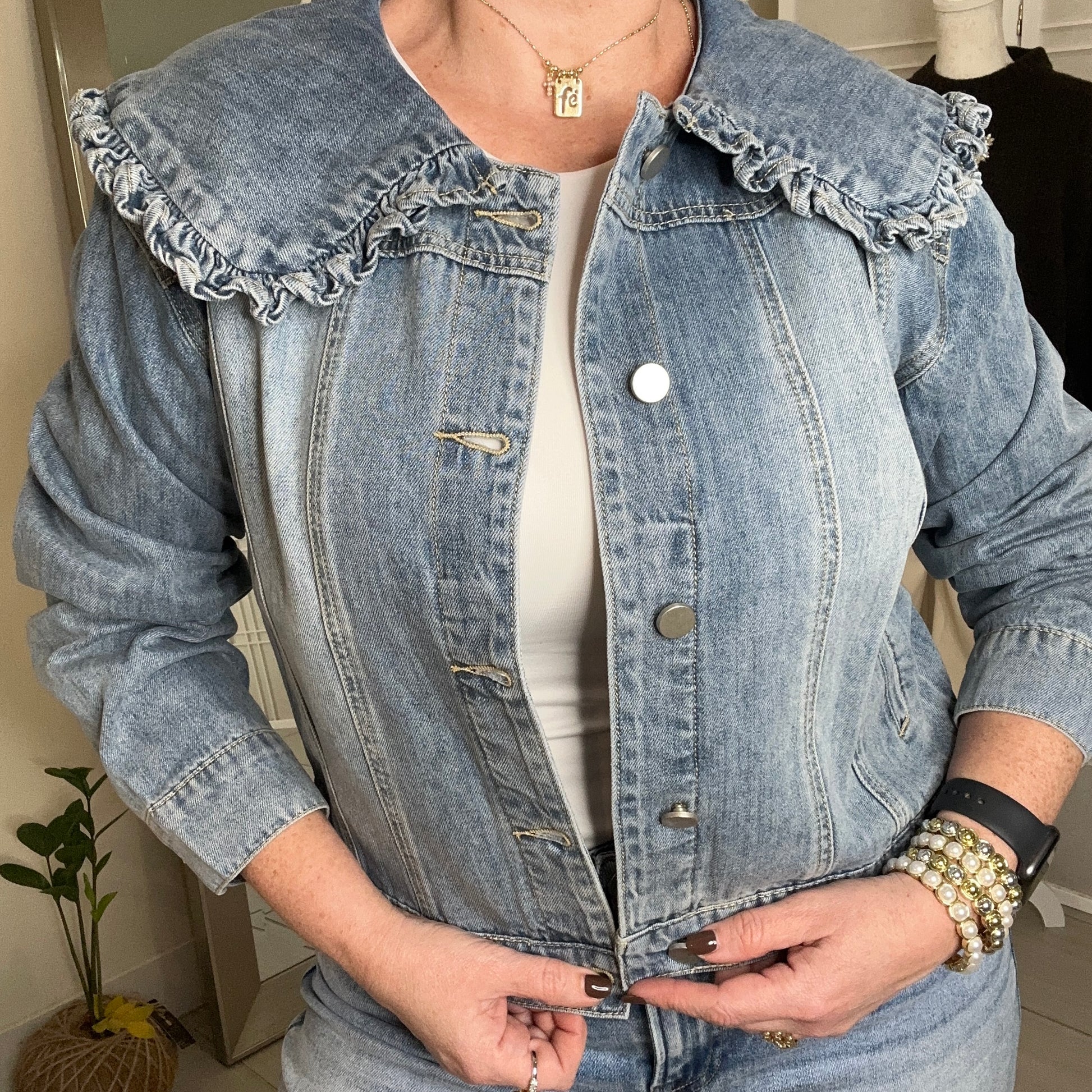 The Evangelina jacket boasts a feminine design that beautifully highlights the neck. With a full size, this jacket offers both style and comfort for any occasion. Elevate your wardrobe with this elegant and versatile piece.