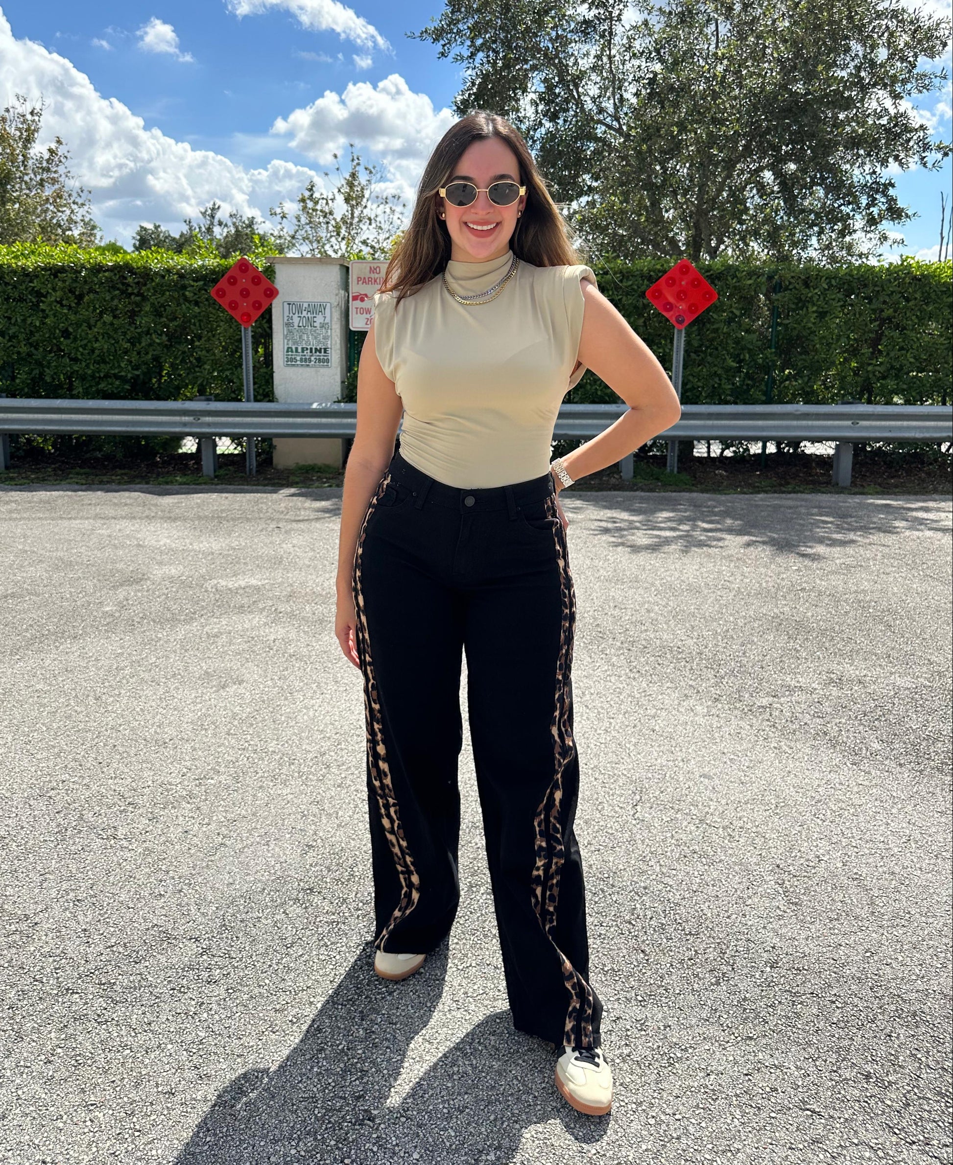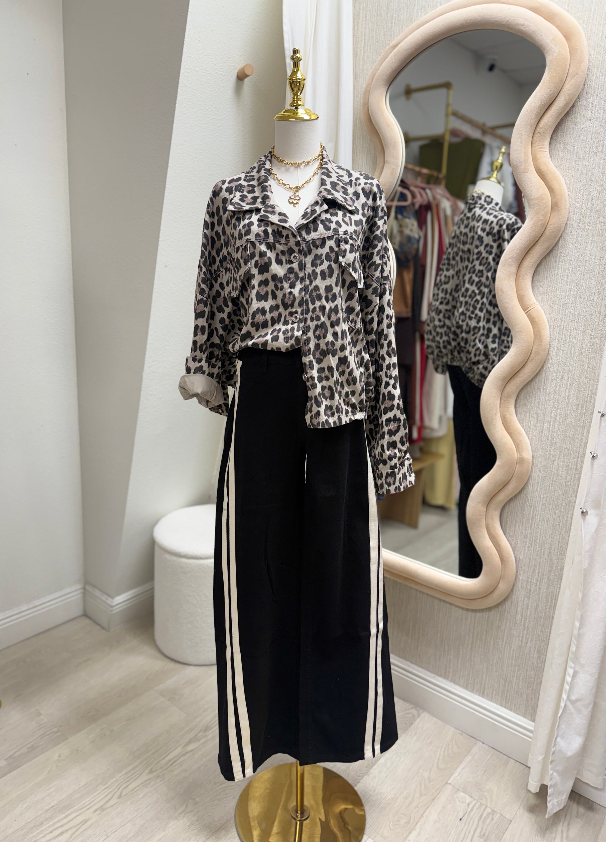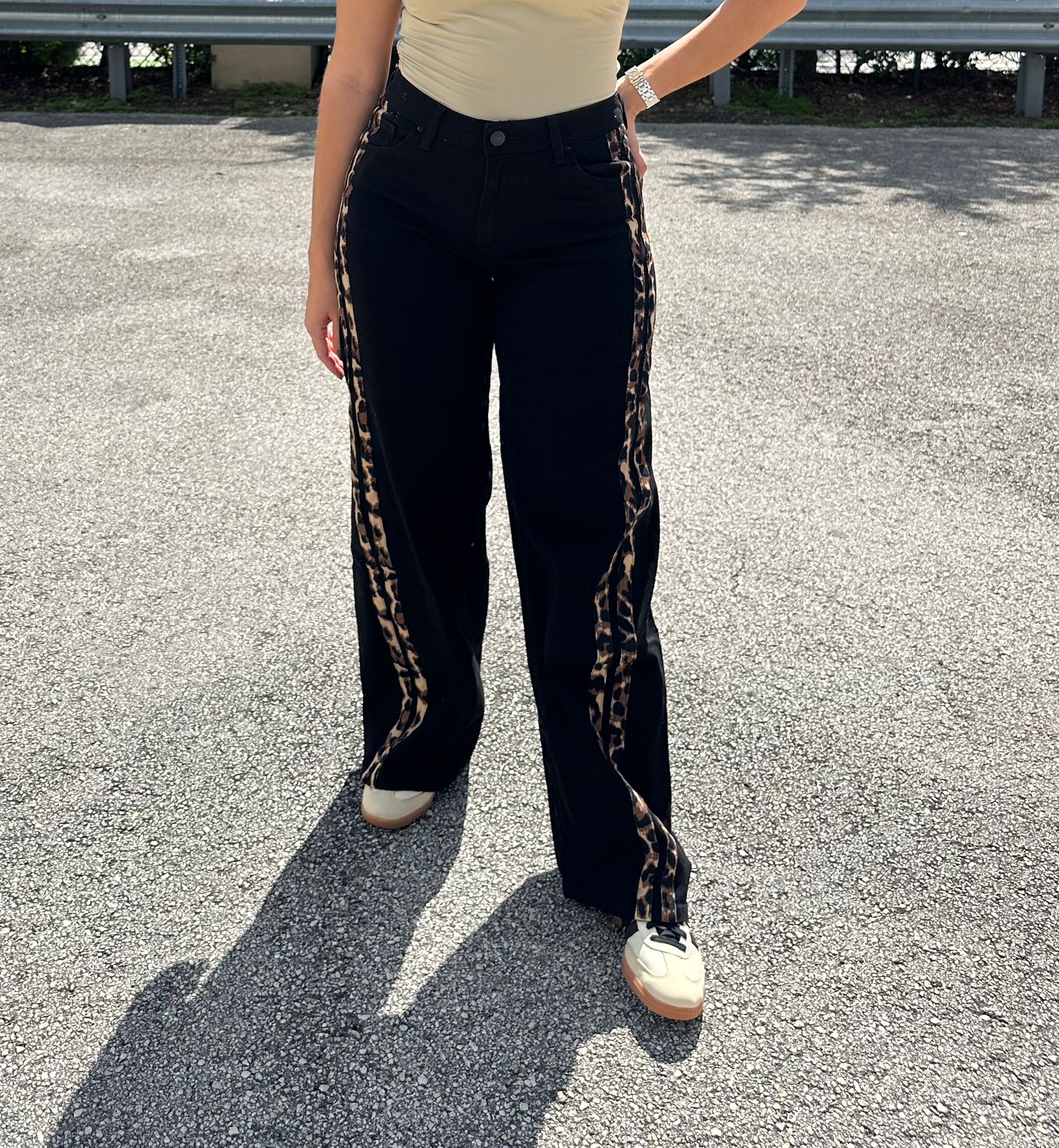 Upgrade your wardrobe with Fabi Jeán! This versatile stretch black jeans with animal print side stripes adds a touch of edginess to any outfit. Stay comfortable and stylish with Fabi Jeán.