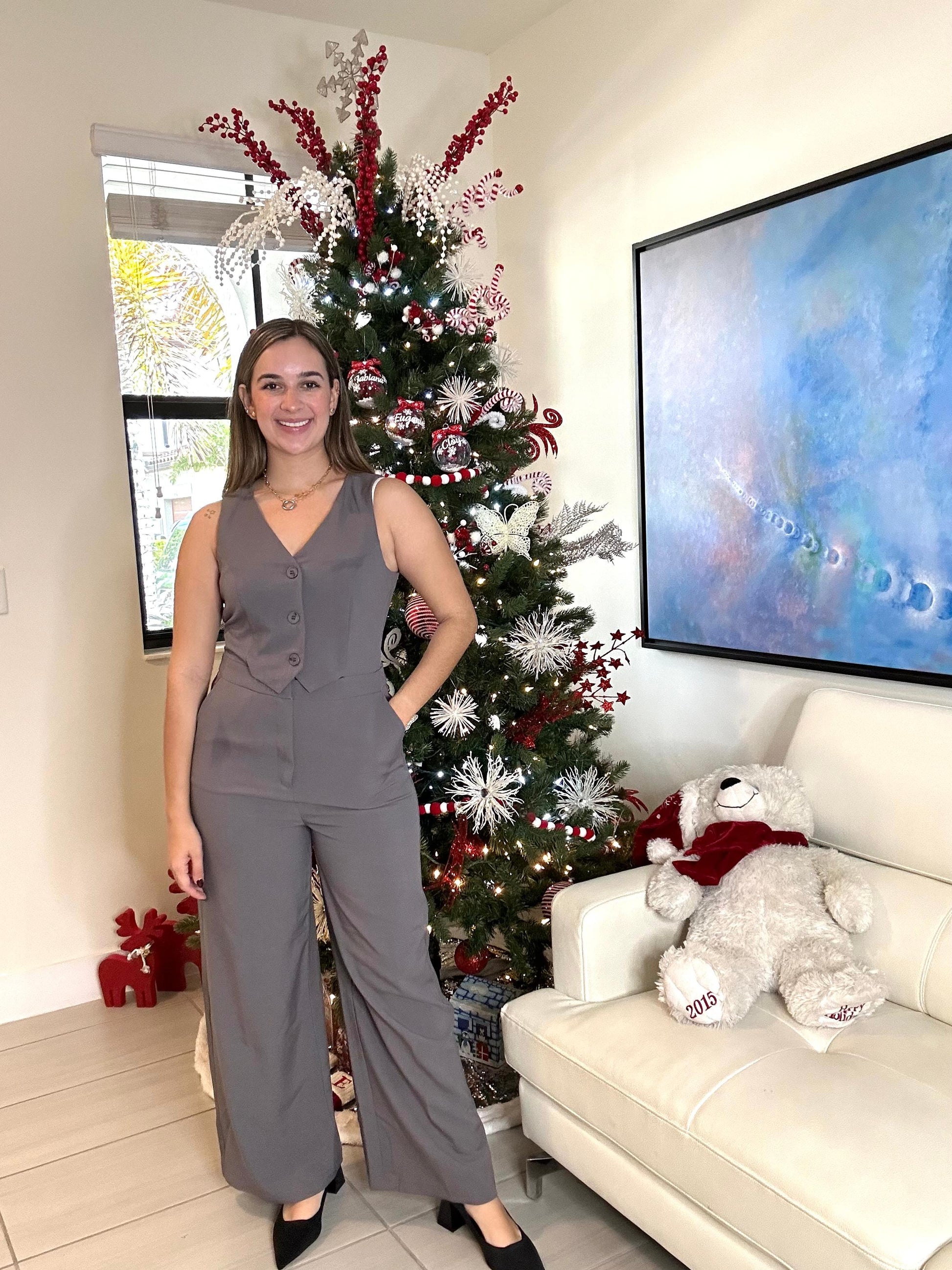 Effortlessly chic and stylish, the Fabiola Jumpsuit is a must-have for any fashion-forward wardrobe. Designed with true size measurements, this jumpsuit features a unique pants and vest combination that provides both comfort and versatility. Elevate your look with this timeless piece that embodies both confidence and sophistication.
