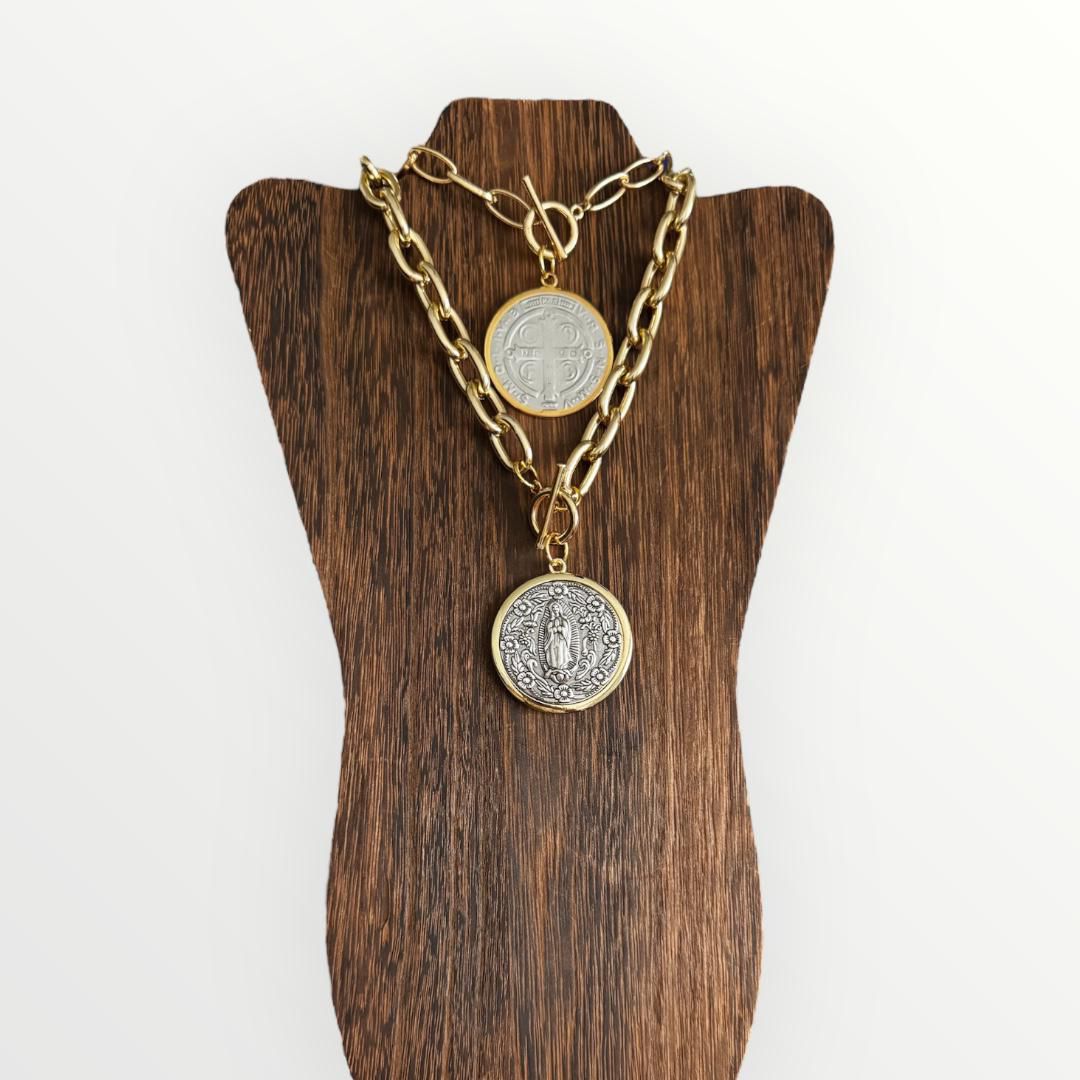 Discover the Guadalupe Necklace, a meaningful accessory that combines the iconic San Benito and Our Lady of Guadalupe symbols. This elegant piece not only enhances your style but also serves as a powerful emblem of faith and protection. Perfect for daily wear or special occasions, it offers both spiritual significance and timeless beauty. Embrace a symbol that inspires and safeguards you wherever you go.