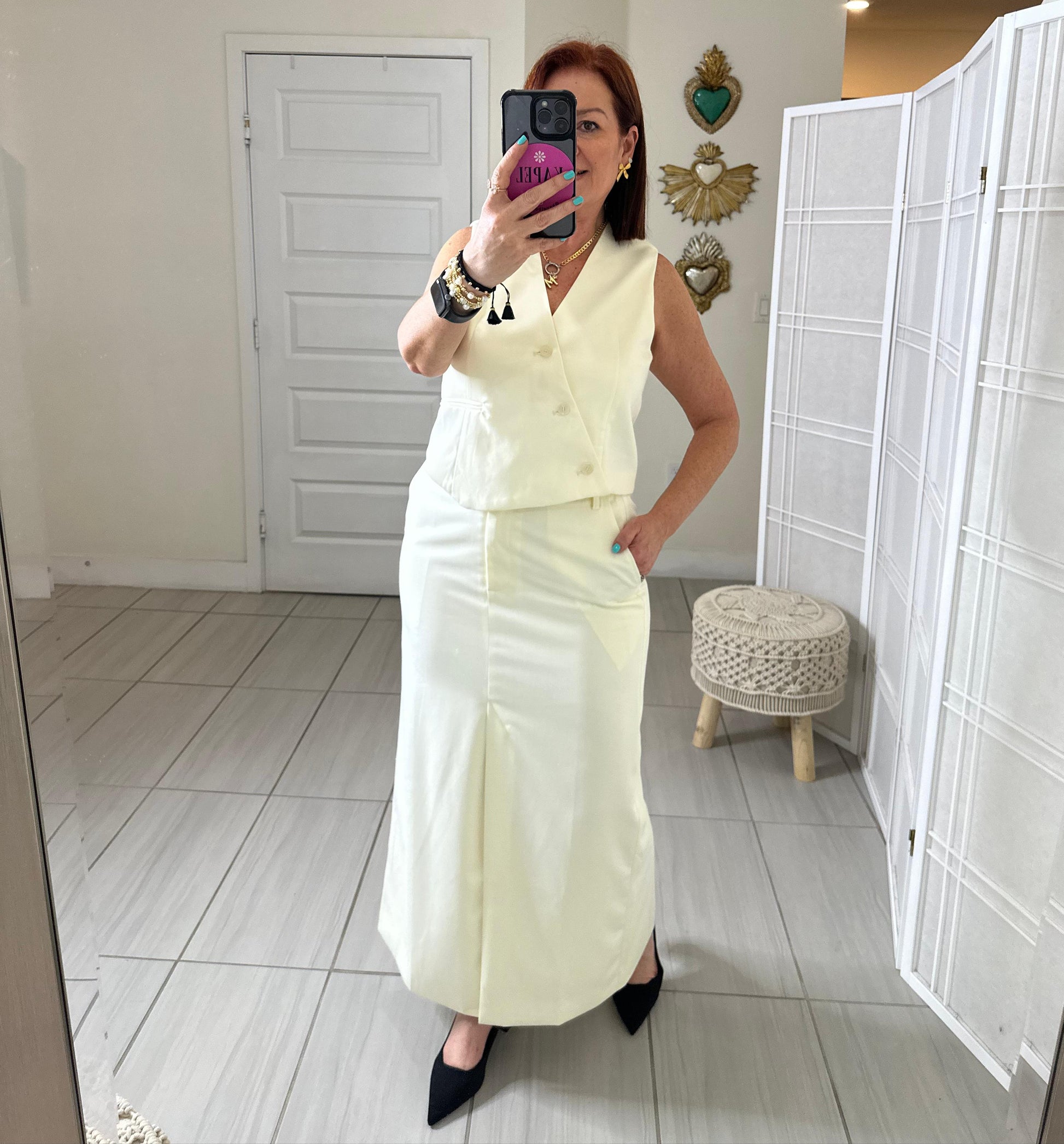 Introducing the Manuela Set: Perfectly tailored skirt and vest ensemble, available in true sizes S, M, L. Elevate your wardrobe with this versatile set!