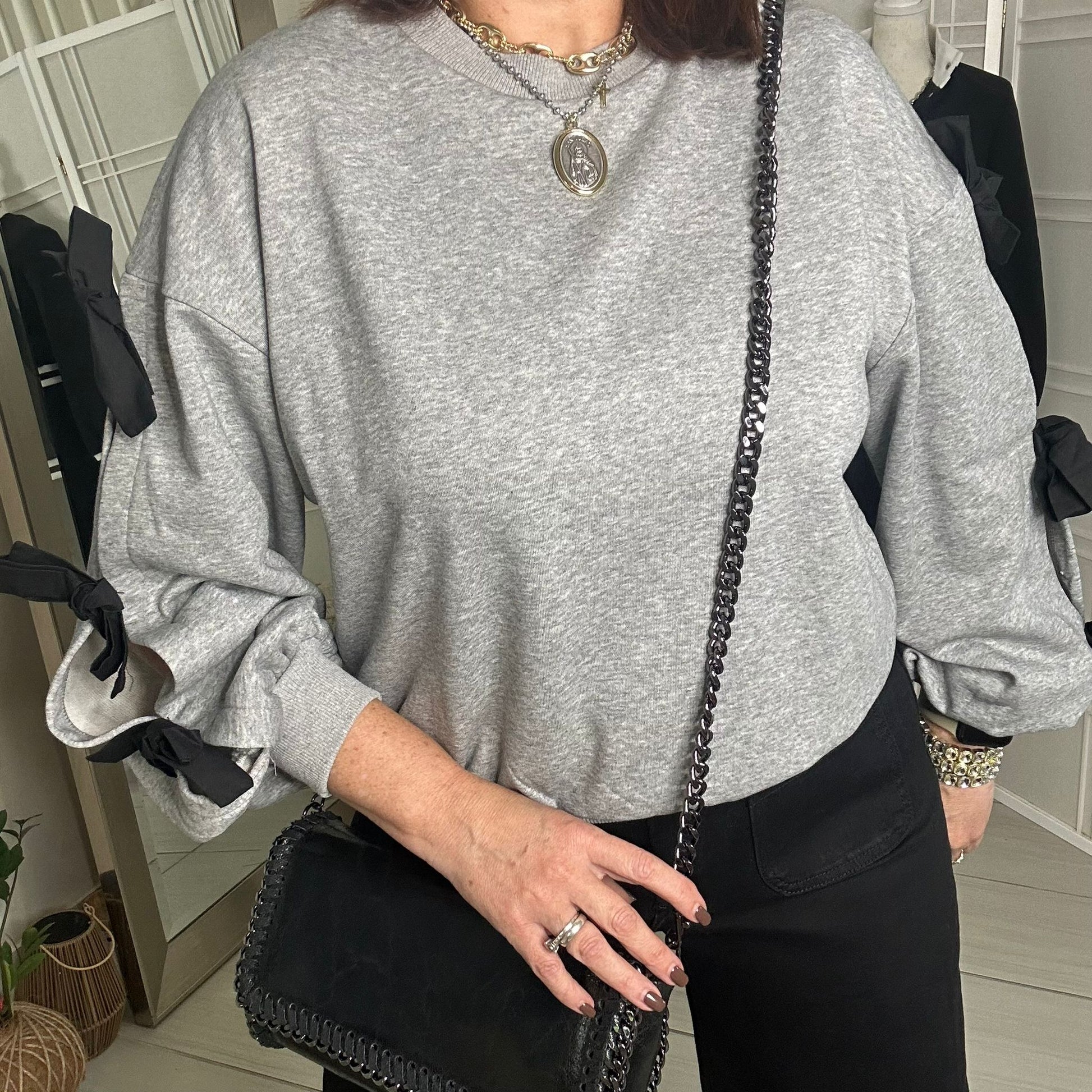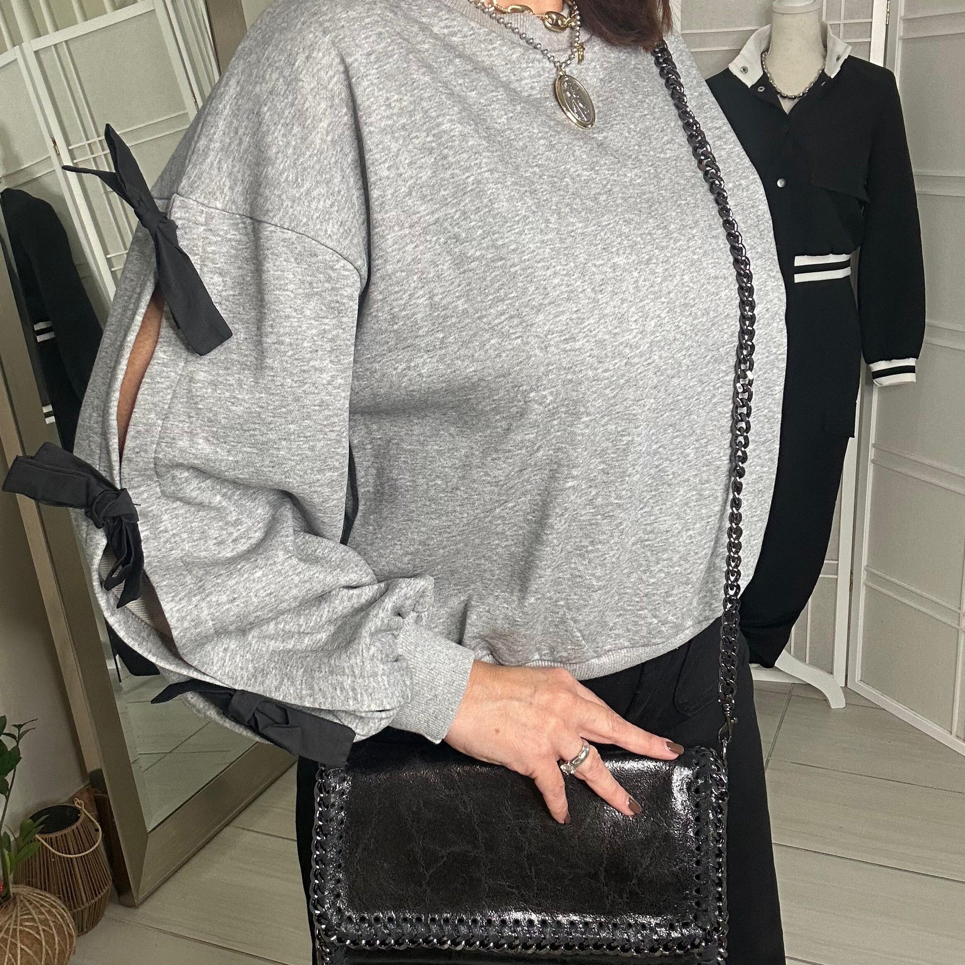 Wrap yourself in cozy comfort with our Paola sweater! Made with soft cotton and adorned with delicate bow details on the sleeves, this sweater is both stylish and comfortable. Perfect for chilly days or a night out, you'll love the versatility and charm of our Paola sweater.