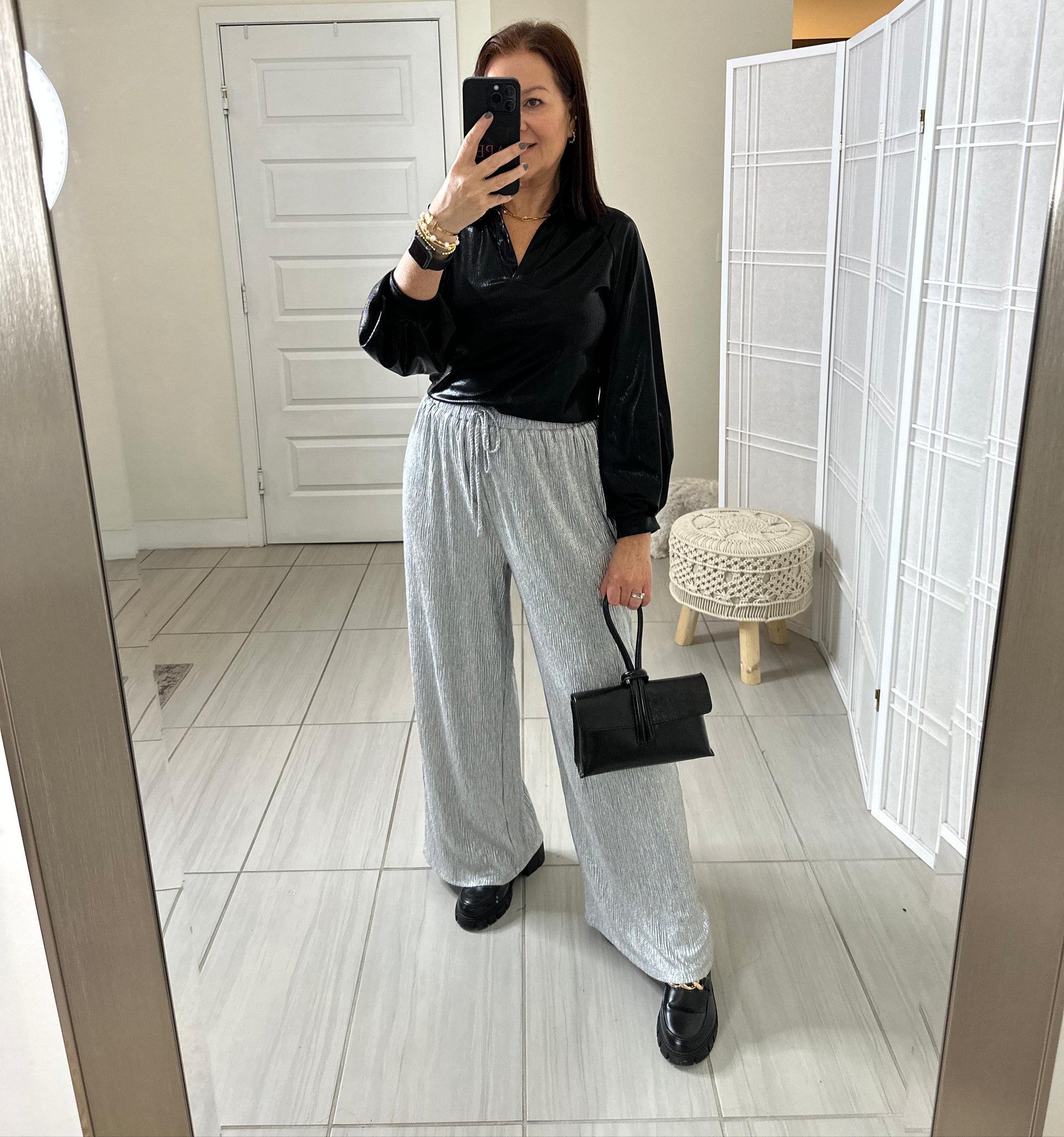 "Elevate your style with Wanda Metallic Pants: Elastic waist, available in sizes S, M, and L, made from soft viscose for ultimate comfort.