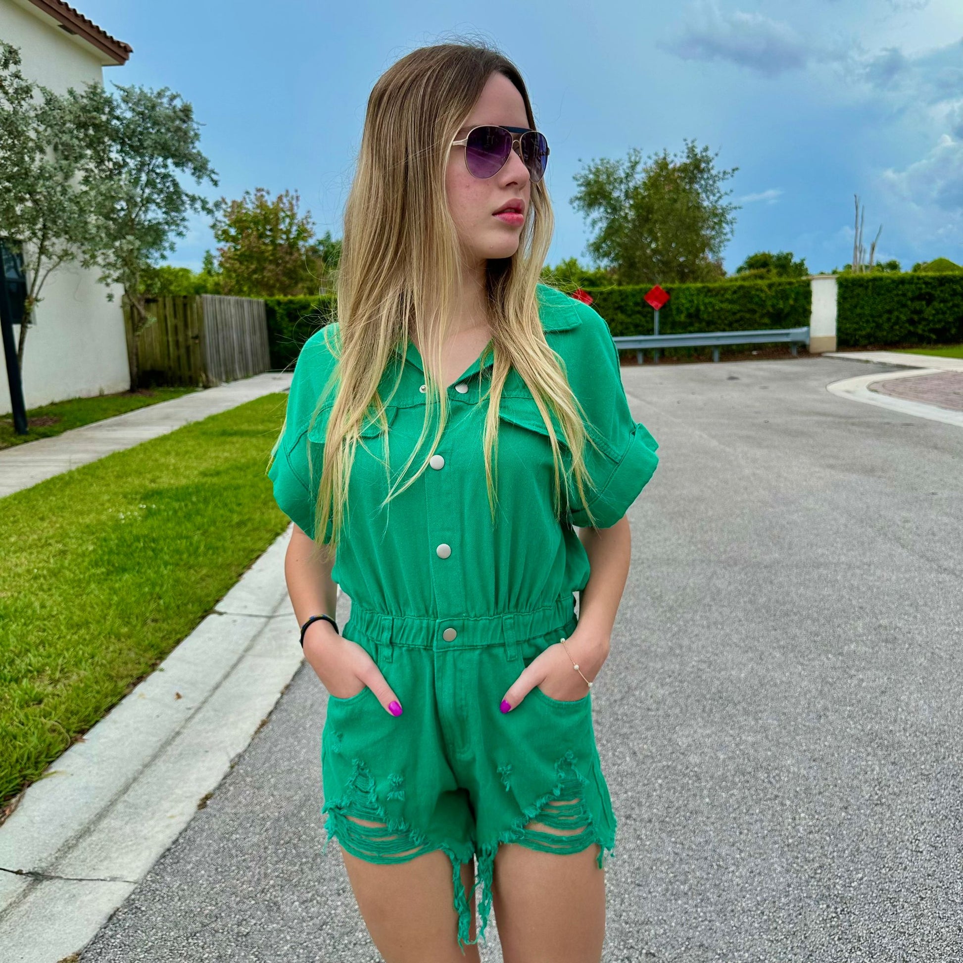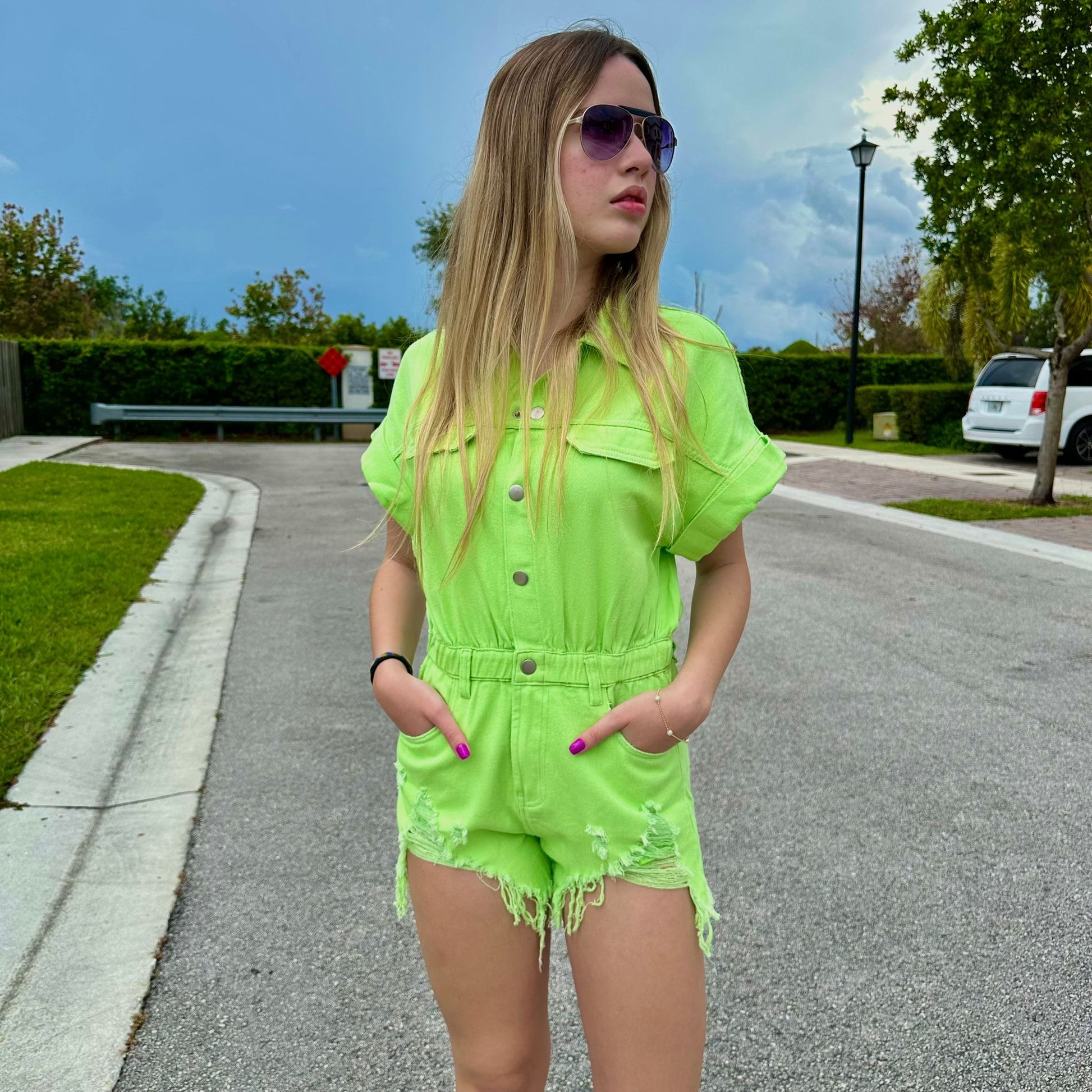 Elevate your summer style with the Xaviera Romper, crafted from high-quality jean fabric. This true-sized romper comes in an array of stunning colors: Green, Acid Green and White.