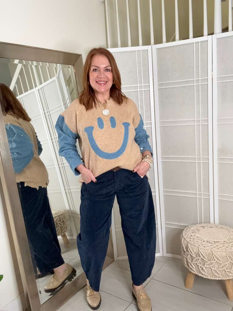 The Zunny Sweater features a cheerful happy face design and comes in one versatile size that comfortably fits S, M, L, and XL. Cozy and stylish, it’s perfect for brightening your day while ensuring a great fit for a range of body types. Add a playful touch to your wardrobe with this effortless, feel-good piece.